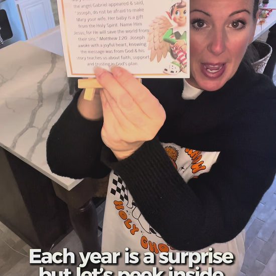 Each day comes pre-packaged with a story card & accessories: a Nativity piece, your elf/elves tiny prop & trinkets for your child that help us keep each day focused on what matters, Jesus!!